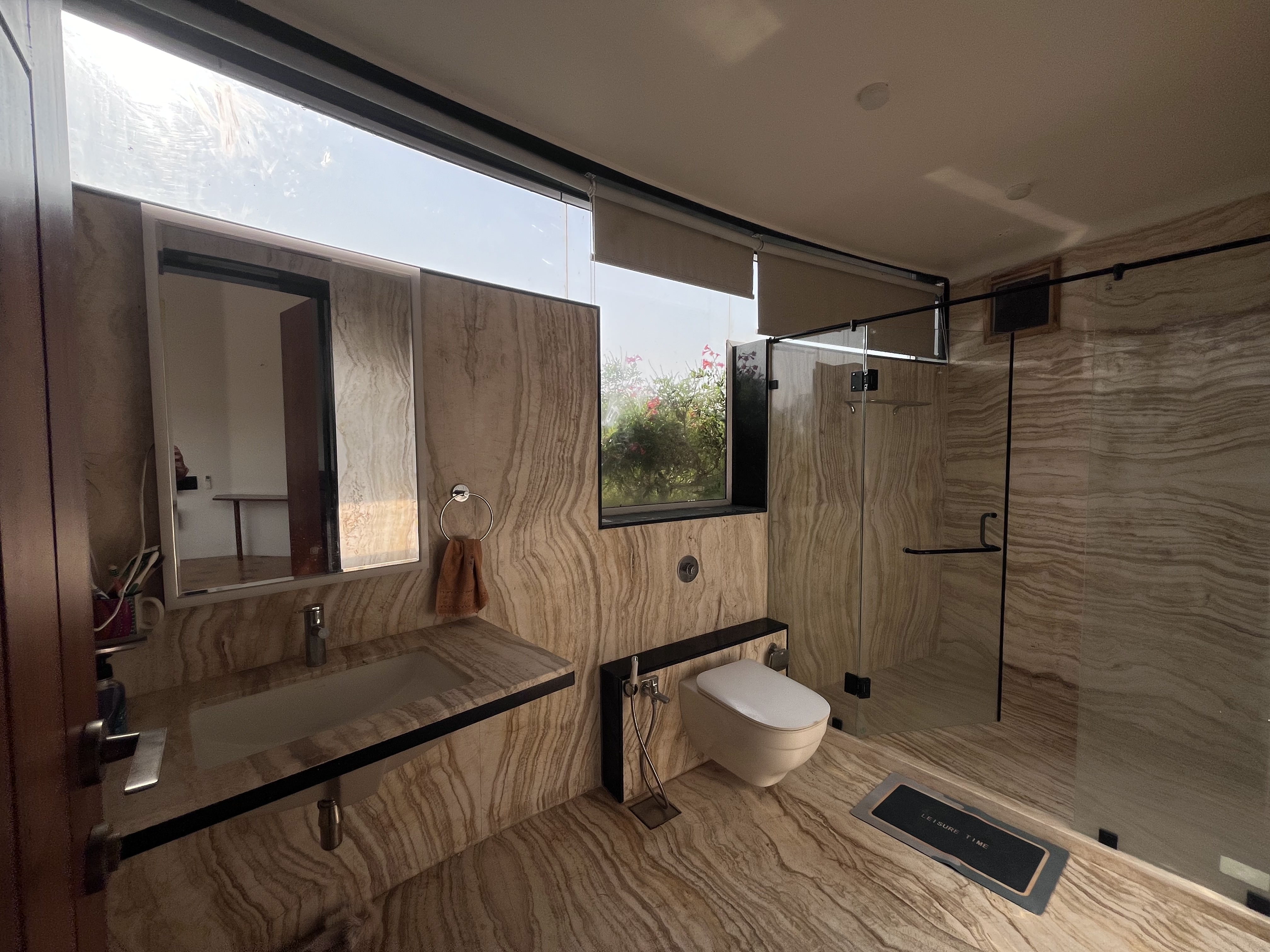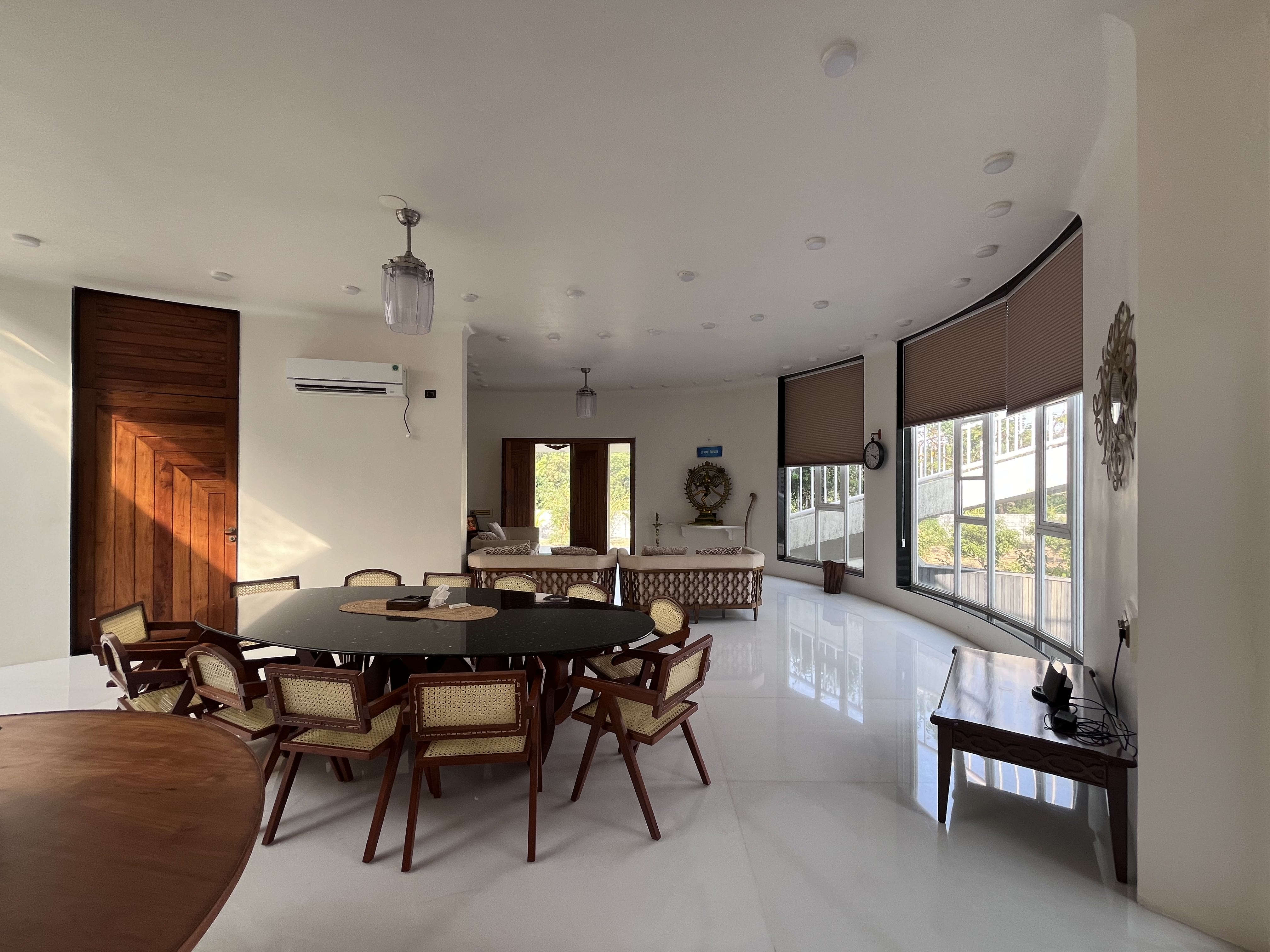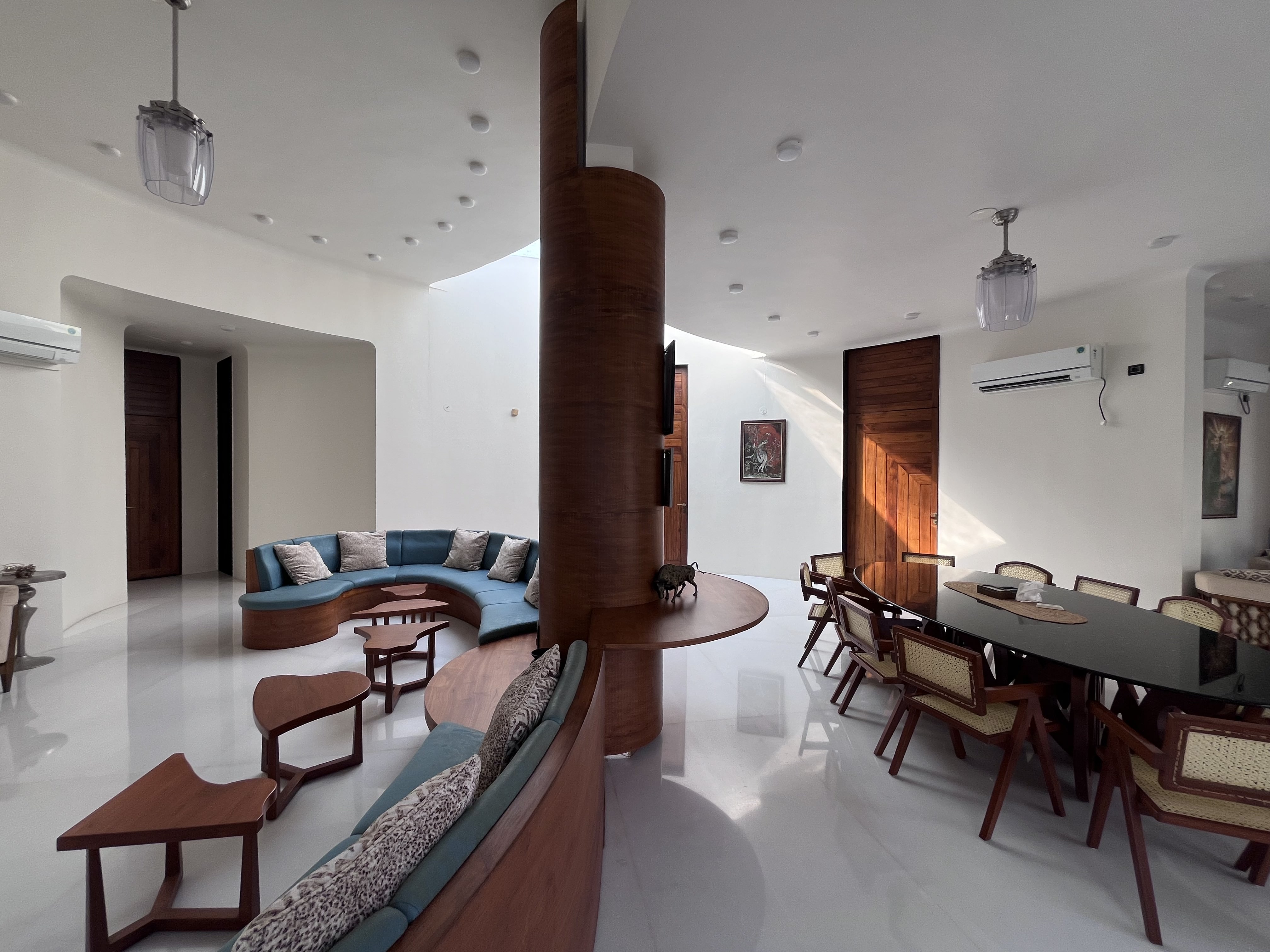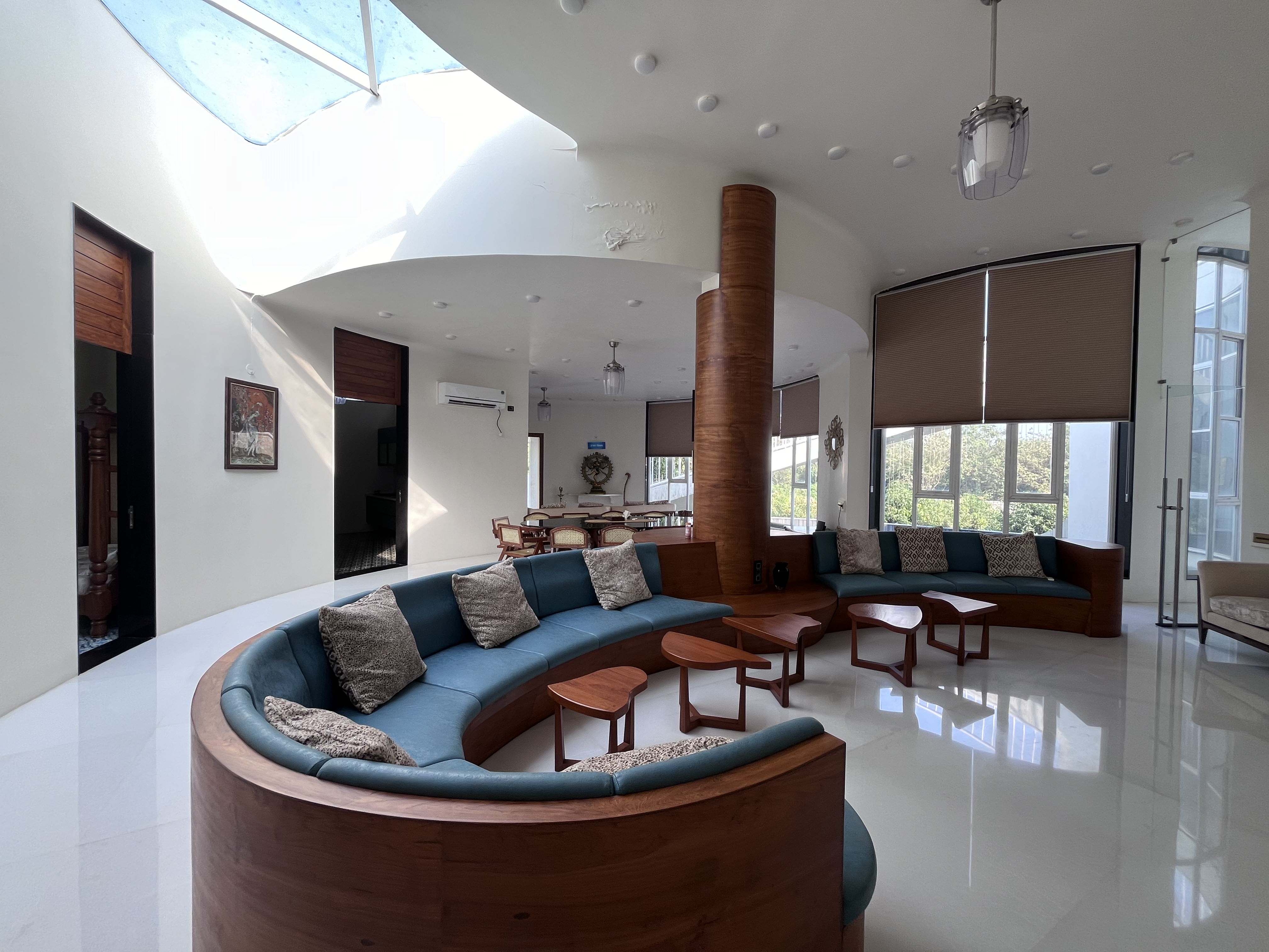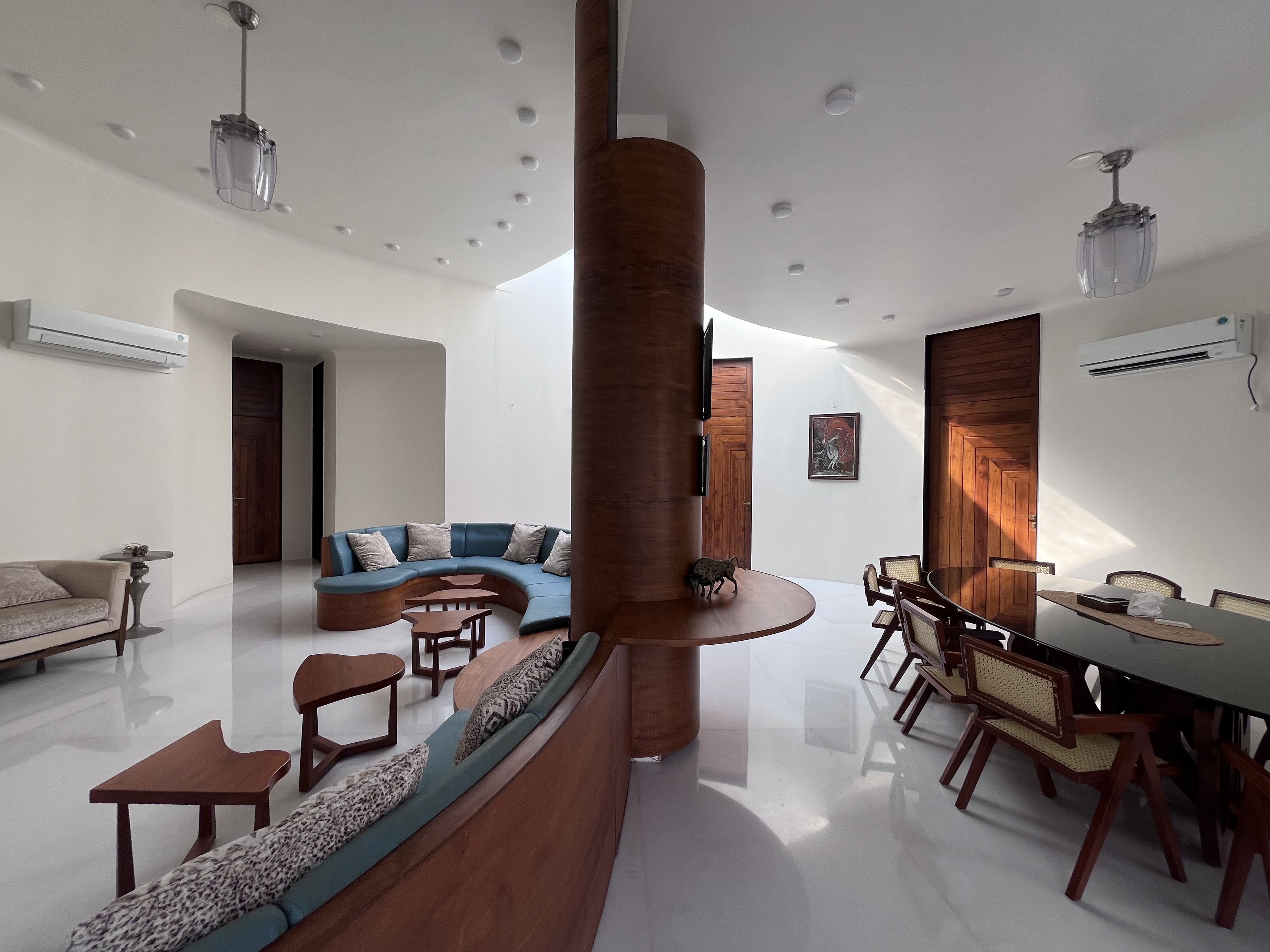 This is a unique residence in several aspects. Located within a young mango orchard. The site offers a novel setting. The idea of the house began as a simple yin-yang diagram. A simple ground floor structure with a semi-sunk courtyard, the house offers un-interrupted views of the mango orchard. The terrace has been converted to a garden with light weight soil and drawing systems. The most challenging part of the idea was the conversion of the yin yang diagram into functional units of space. The house accommodates 4 bedrooms and other living units with a courtyard that is accessible from within the house.